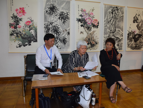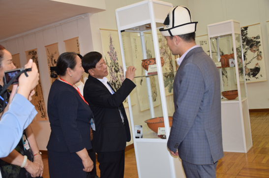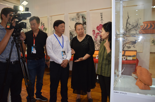 公司總經(jīng)理劉新安為吉爾吉斯斯坦前總統(tǒng)奧通巴耶娃講解黃河澄泥硯《九九歸一硯》