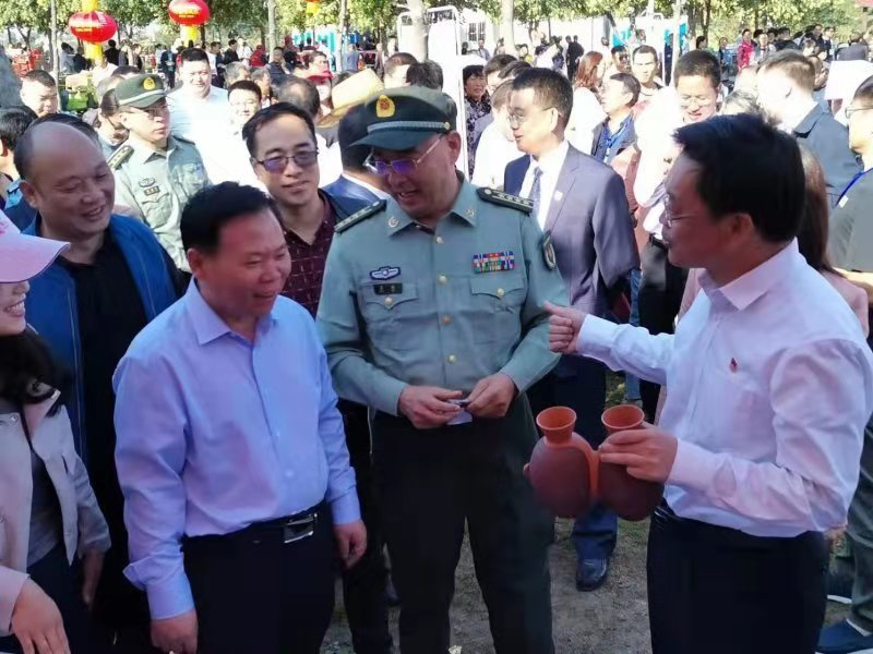 三門峽市市委書記劉南昌,市委常委三門峽市軍分區(qū)政委孟斌,縣委書記楊躍民參觀仰韶彩陶坊。